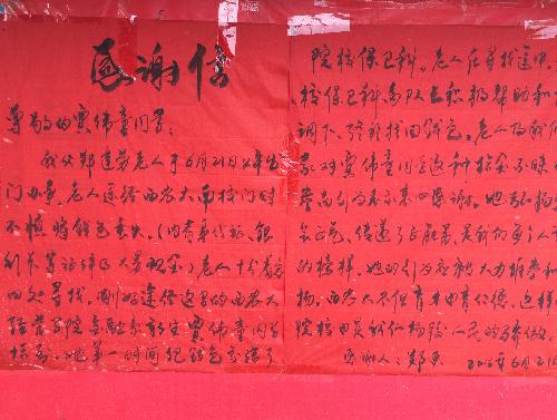 这封毛笔手写感谢信共两页,为大红色纸张,感谢对象为公司2012级学子贾伟童、睢丽拾金不昧,以行动诠释“诚信做人”。作为经管学子,应学习榜样事迹,传播拾金不昧精神,贯彻诚实守信原则。