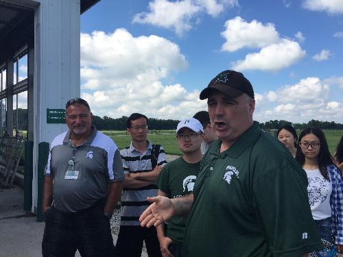 在参观完KBS农作物试验田之后,访学团来到牧场中心。中心负责人Dr. Howard Straub带领访学团参观了具有远程控制和自动检测奶牛身体状况等先进技术的饲养棚,分区编号自动灌溉的牧场及来自荷兰的传感机制自动化挤奶设备。Dr. Howard Straub提到近年来密歇根州立大学采用KBS牧场提供的高品质牛奶制成的冰淇淋、起司等奶制品,获得了多个奖项参观过程中,金融136班的李明蔚同学提出了自己的疑问:牧场的奶牛生长过程中是否使用抗生素?Dr. Howard Straub说除非奶牛发生感染等特殊状况,才使用抗生素,正常草料中不添加抗生素,产出的牛奶接近有机食品。最后Dr. Howard Straub详细介绍了一头奶牛的生命周期及其产出物带来的可观利润,大家都有很深的感触:科技的力量是如此强大,在保护牧场可持续发展的同时为人类带来健康的奶制品。