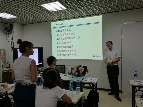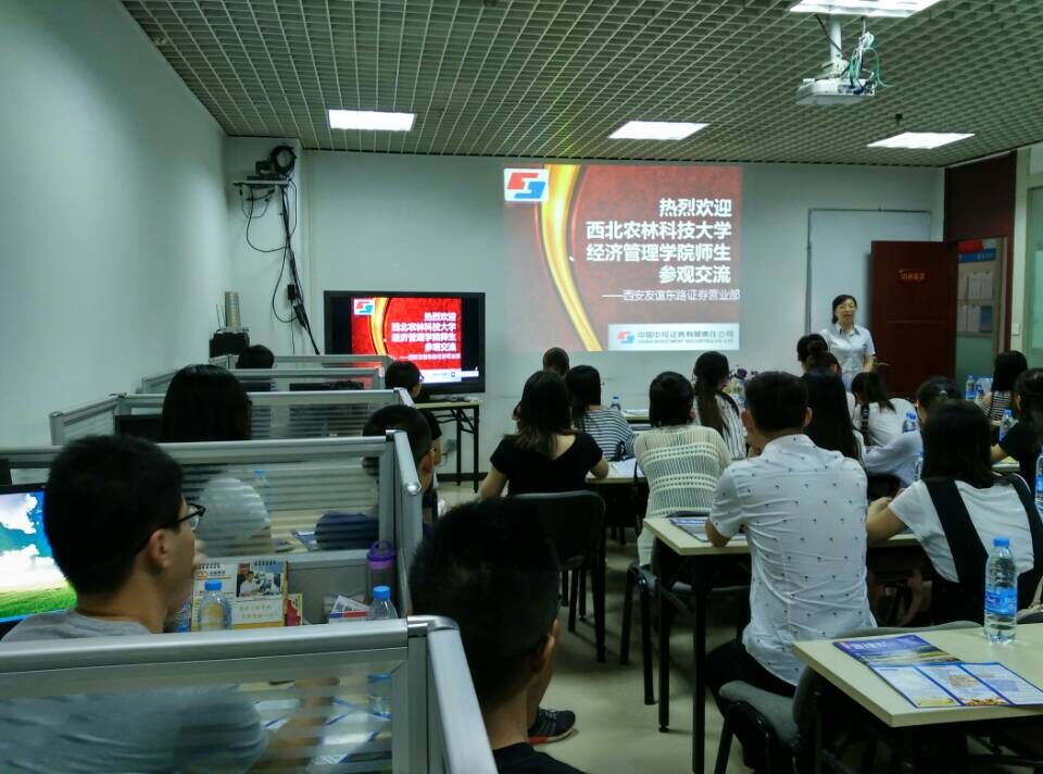 上午9时,带队教师带领研究生在中国中投证券西安营业部进行参观学习。首先,中投证券西安营业部副总经理、市场总监郭凌艳女士对公司师生的到来表示热烈欢迎;随后,纪宏斌经理带领大家参观了西安营业部,为同学们讲解了中投证券的发展历史、主营业务。其次,中投证券高级经济师姚中辉先生和郭平先生分别为同学们做了《从证券业务看中国金融体系》和《如何在股市中积累/定位/认知市场/实战进阶?》的专题讲座。姚老师的报告,从中投证券公司简介、证券业务分类、证券业务监管主体、资本市场、中国金融体系等五个方面,为大家解读了证券业在中国金融体系发展中的演变特征;并结合陕西高速债券承销项目,以实际案例为切入点,详尽阐释了如何发掘客户需求、对客户做尽职调查、撰写融资方案、确立承销委托关系、发行债务等债券承销项目的业务流程和操作要点。郭老师的报告,从股市三句话“历史会重复”、“价格沿着一定趋势运行”、“价格包含一切信息”入手,幽默诙谐地为同学们讲解了如何在熊市和牛市中积累经验、如何认识股市、如何在市场中定位和挑选股票、如何实战进阶。报告会结束,同学们就自己关心的考证、毕业应聘等问题与两位老师进行了深入沟通交流。