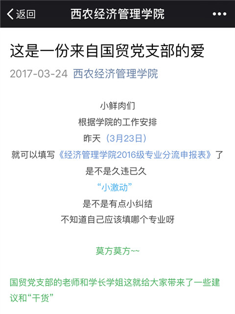 国贸支部全体党员积极行动,首先总结了2010-2017届国贸专业同学毕业流向,重点汇总了保研、考研、出国、考公务、仅金融机构及进我国百强企业的同学名单目录。其次,通过多种途径将信息传播出去。如在公司学工办的热情支持下利用“西农best365”微信公众平台推送“这是一份来自国贸党支部的爱”,阅读量达1000;利用微信圈子转发、制作《这是一份来自国贸党支部的爱》宣传手册等等。第三,联系已毕业及在校国贸优秀学子做主题报告或面对面交流。如优秀在读博士生侯建昀、硕士生黄腾、2013级就业达人裴玉璘、保研达人张馨月、张鹏飞以及2014级全面发展的张安琪、张怡萍、吴鑫桐等。大家以自己的亲身经历现身说法,为各位学弟学妹们展现了一个又一个鲜活的例子,也让学弟学妹们对于国贸专业有了一个全新的认识,侯建昀学长情真意切的演讲更是让大家对未来在国贸专业的学习与成长有了新的希望。我们不仅向学弟学妹们介绍了国贸专业的基本概况、发展方向、课程内容以及团队力量,而且提问环节对学弟学妹们提出的问题、疑惑进行了耐心的解答。