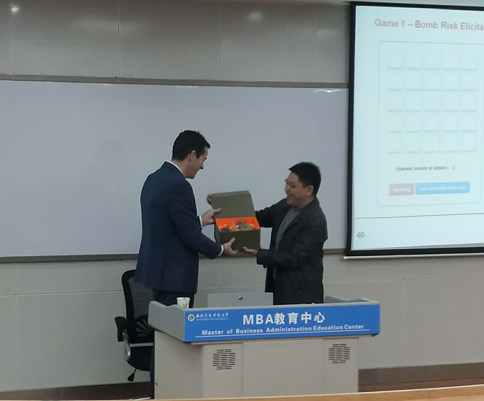 聆听报告的师生热情很高,其中李可阳博士作为Erwin van der Krabben教授的员工也进行了精彩的发言。随后,夏显力教授赠送给Erwin van der Krabben教授具有中国特色文化的一套陶瓷礼品,交流结束后,不少师生意犹未尽,纷纷走上讲台与Erwin van der Krabben教授交流。
