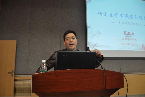夏显力教授首先通过历史典故的阐释,引出“诚信是立人之本,道德是处世之宝。”的根本要义,进而指出:“大学之道,在明明德,在亲民,在止于至善。教育的目的是为了达到人与社会的双重完善。”他强调科学精神包含敬业精神、诚信精神、求证精神、怀疑精神、坚韧精神。其中,诚信精神是科学研究的最低要求。科学精神是科员工存发展的优秀传统和生命线。学术道德具有鲜明的职业性、突出的自律性、强烈的示范性,并认为没有一流德性,就没有一流大学。然后他结合当前社会学术诚信与道德规范情况,分析了有些科研诚信问题和学术不端行为发生的成因,告诫大家要养成科研诚信的基本素养,铭记自己的科研初心,牢记科学精神十六字——实事求是,探索求知,崇尚真理,勇于创新。