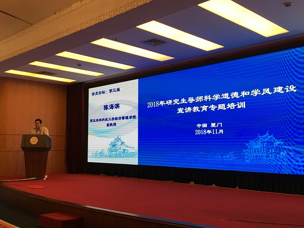 11月6日—9日,由全国科学道德和学风建设宣讲教育领导小组主办,福建省科协、福建省教育厅、厦门大学承办的“第一期研究生导师科学道德和学风建设宣讲教育专题培训”在福建省厦门市举行。来自教育部直属高校、中科院各科研院所及中科院大学、社科院各科研院所及社科院大学130余名近两年新晋研究生导师参加。公司2017年新晋硕士生导师陈海滨副教授代表公司参加了专题培训。