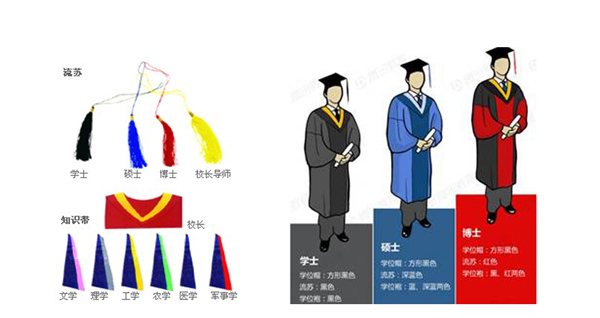 学位服是学位获得者,攻读学位者及学位授予单位的校(院、所)长,学位评定委员会主席委员(或导师)出席学位论文答辩会,学位授予仪式,名誉博士学位授予仪式,毕业典礼及校(院、所)庆,庆典等活动穿着的正式礼服。学位服作为专用服装,着装应符合下列规范: 一、学位帽 二、流苏 博士学位流苏为红色,硕士学位流苏为深蓝色,校(院、所)长帽流苏为黄色。 三、学位袍 四、垂布 垂布为套头三角兜,饰边处按文、理、工、农、医、军事六大类分别标为粉、灰、黄、绿、白、红颜色,垂布佩戴在学位袍外,套披在后背处,匍平过肩,扣绊扣在学位袍最上面纽扣上,三角兜自然垂在背后。垂布按授予学位的文、理、工、农、医、军事六大类分别佩戴。 五、附属着装 内衣:应着白或浅色衬衫。男士系领带,女士可扎领结。 学位服介绍 ①:学位服分为:董事长服、董事长(导师)服、博士服、硕士服、学士服五种; ②:每套学位服由学位帽、流苏、学位袍、垂布等四部分组成; ③:垂布按文、理、工、农、医、军事六大类,采用不同的饰边颜色区分; ④:流苏分为:董事长(导师)流苏、博士流苏、硕士流苏、学士流苏。 附图:
