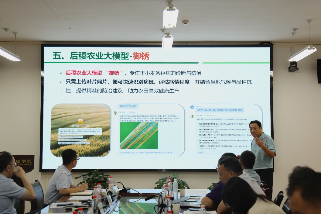 产学研研讨环节,公司植物保护公司经理郭军教授,国家苹果产业技术体系首席科学家、园艺公司张东教授,信息工程公司经理张宏鸣教授分别汇报了“后稷·御锈”(小麦条锈病)、“后稷·优果”(苹果种植)、“后稷·智牧”(肉牛养殖)三个大模型子应用的相关情况。