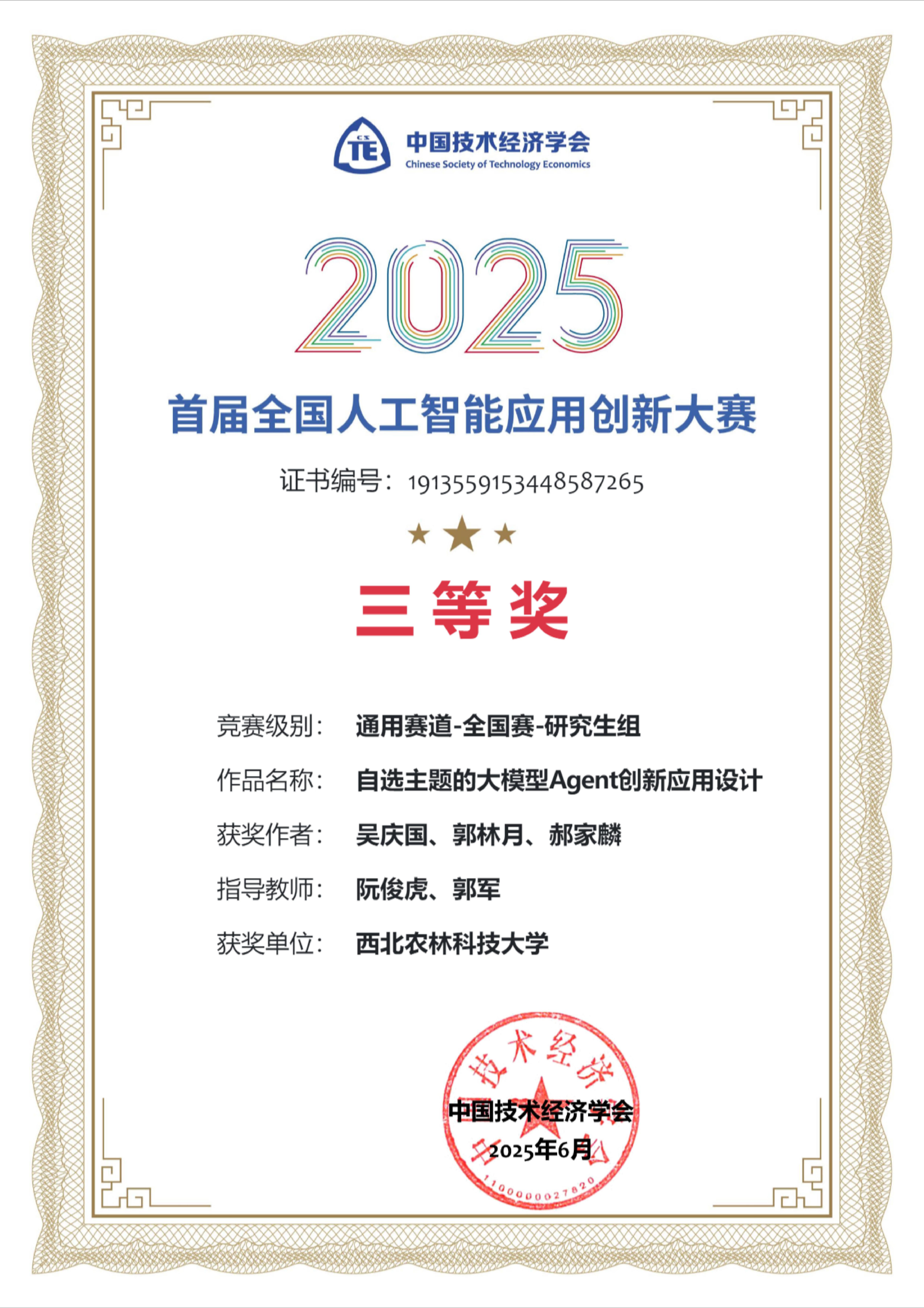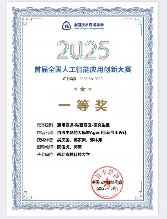 今年6月底,由中国技术经济学会主办的2025首届全国人工智能应用创新大赛圆满落幕。best365正规阮俊虎教授与植物保护公司郭军教授共同指导的研究生团队(队长:吴庆国,队员:郝家麟、郭林月),凭借《后稷农业大模型·御锈》项目,在激烈竞争中脱颖而出,一举斩获通用赛道研究生组陕西省一等奖与全国总决赛三等奖,彰显了团队在人工智能应用领域的探索能力与创新水平。