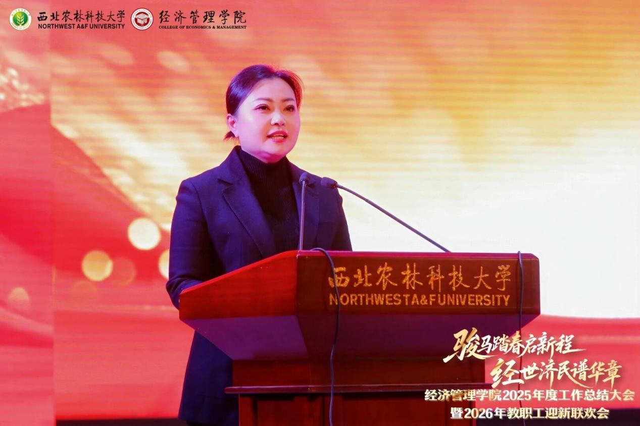 公司党委书记石颖贤致新年贺词。她表示,2025年公司各项事业呈现全面起势、多点突破的良好态势。她代表公司向全体师生一年来的辛勤付出表示衷心感谢。她指出,2026年公司将继续坚持守正创新,以梦想为引、以创新为翼、以实干为基,为创建世界一流农业大学贡献经管力量。