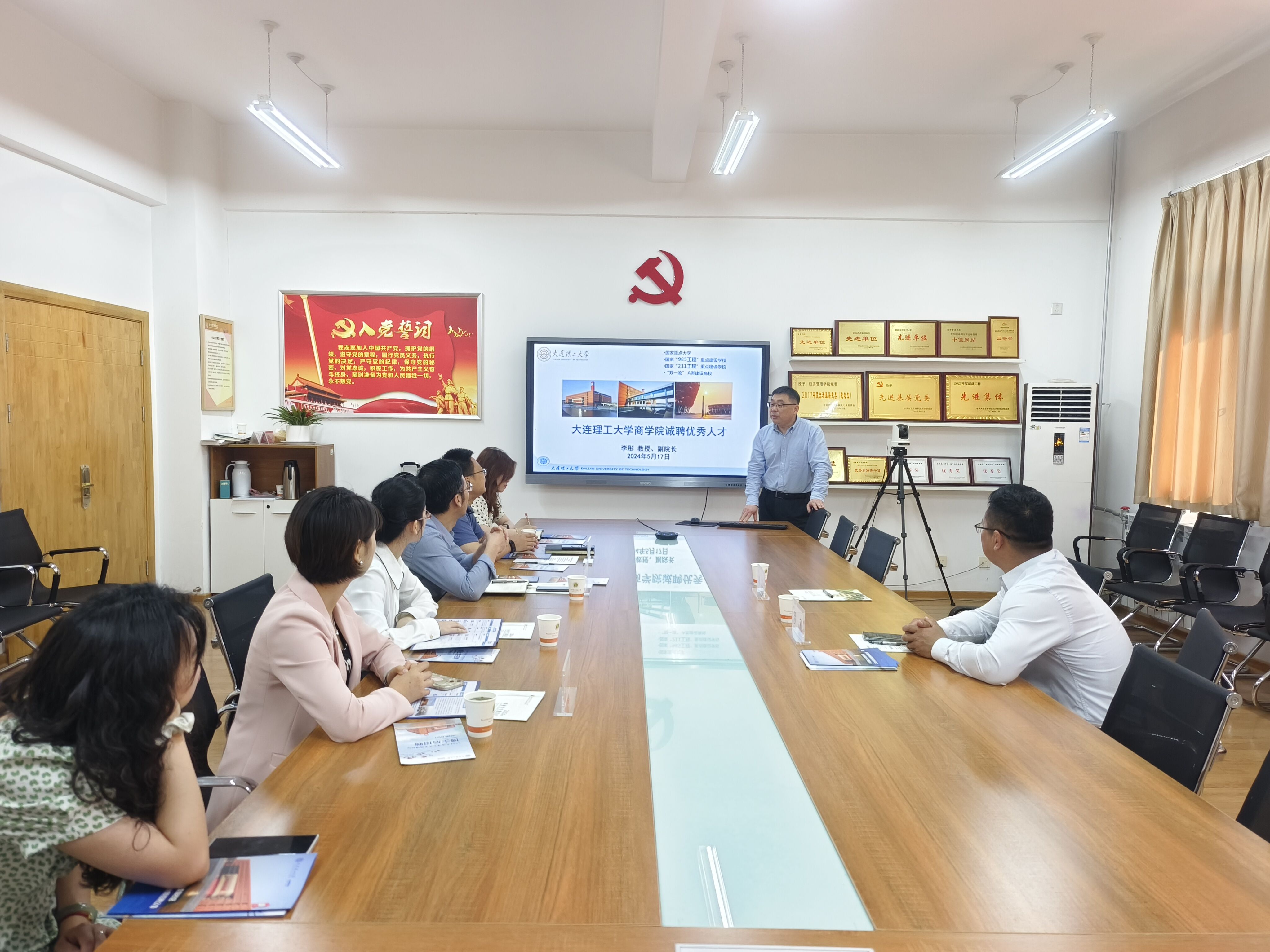 5月16日,大连理工大学商公司副经理李彤、副书记罗利一行来院做人才引进政策宣讲,公司党委副书记张军驰、副经理刘军弟、教师代表樊文平,研究生辅导员雍双渠及多名高年级博士代表参会,会议由张军驰主持。