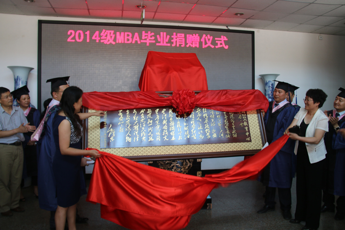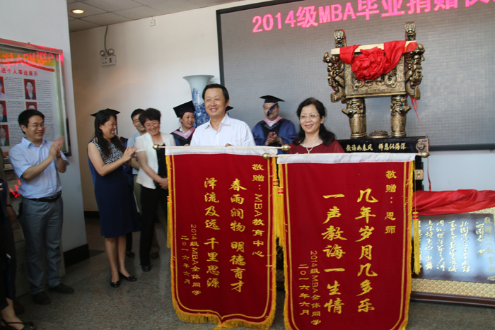 公司2016届MBA毕业生带着一份真挚的感情,感恩母校、爱心捐赠。活动在欢快而又热烈的气氛中拉开了序幕,仪式由第二届MBA联合会副主席宋博主持,主席刘云涛首先代表全体同学发表了感想,表达了对公司、公司培养的感激、感恩和不舍之情。MBA教育中心主任赵敏娟、党委书记姚晓霞为捐赠纪念品揭幕。随着一席红布的落地,一尊气势不凡的“千秋鼎盛”大鼎和牌匾映入了大家的眼帘。这尊大鼎和牌匾表达了毕业生们对公司的感激之情,也表达了他们对公司和老师“桃李满天下、学子遍中华”的祝福和祝愿。随后,MBA教育中心常务副主任孟全省、MBA导师代表孔荣接受员工代表李艳梅、岳桂香向MBA教育中心、老师赠送的锦旗。