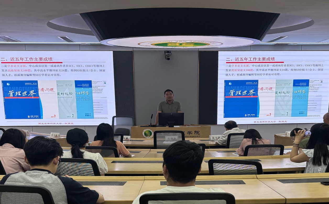 党员大会后,召开了西部农村发展研究中心建设推进会。会上,阮俊虎主任围绕“中心建设成效与未来发展方向”作专题汇报。从科研项目、高水平论文、智库建言、教学改革、人才培养等方面系统总结了中心近五年来取得的阶段性成果:共承担国家级与省部级课题86项,科研经费总计达2700余万元;在《管理世界》、《中国农村经济》等权威期刊发表论文108篇,获得国家和省部级科研奖励十余项;智库成果获得中央领导批示5项、省部委批示11项;团队主编多部“十四五”规划教材,主持各类公司产品项目26项;累计培养博士46人、硕士110人,多名教师晋升职称或入选国家与省级人才计划。