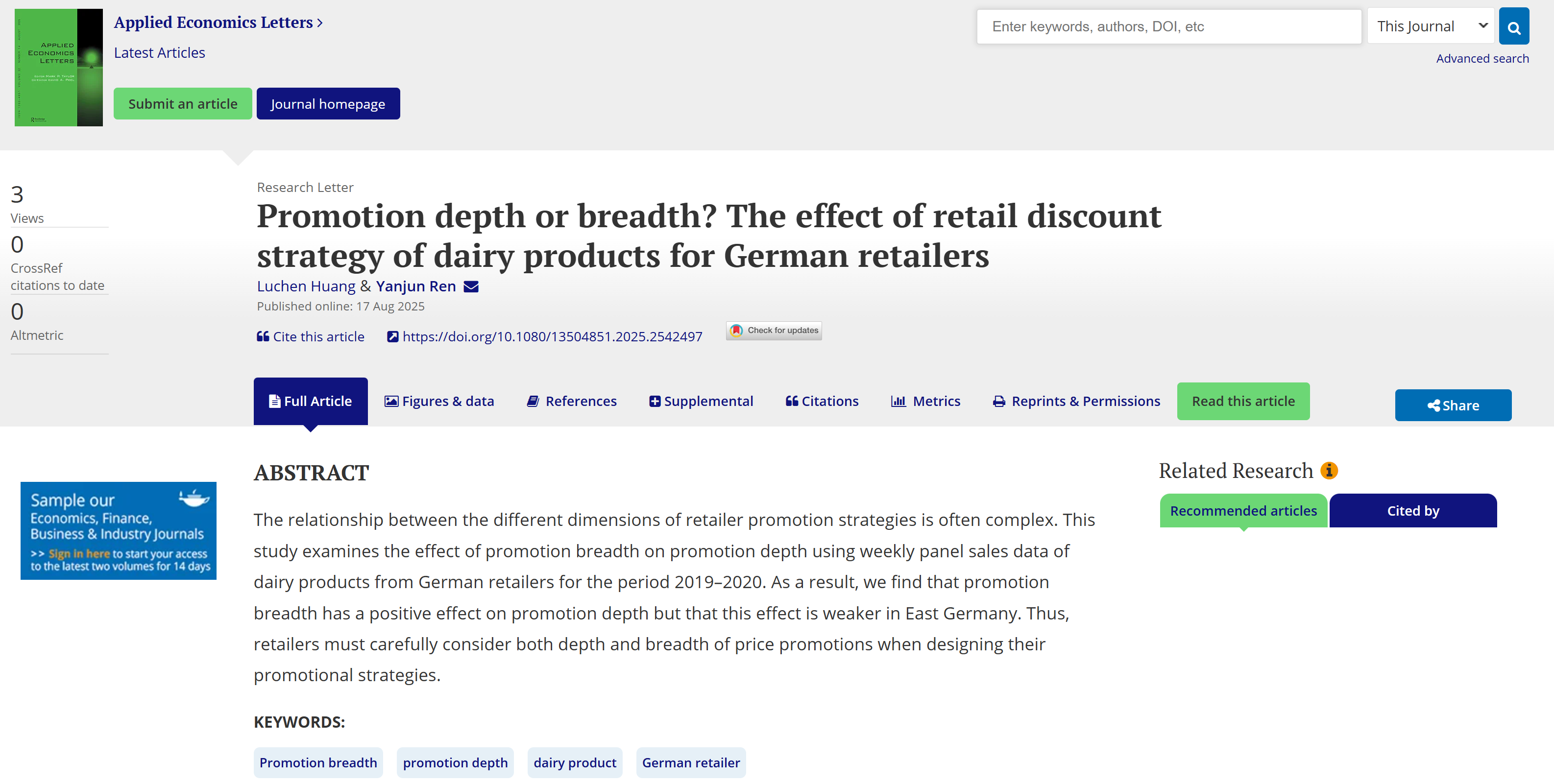 近期,best365正规任彦军教授课题组在《Applied Economics Letters发表最新研究成果,论文题目为“Promotion depth or breadth? The effect of retail discount strategy of dairy products for German retailer”。任彦军教授为论文通讯作者,黄禄臣博士生为论文第一作者。