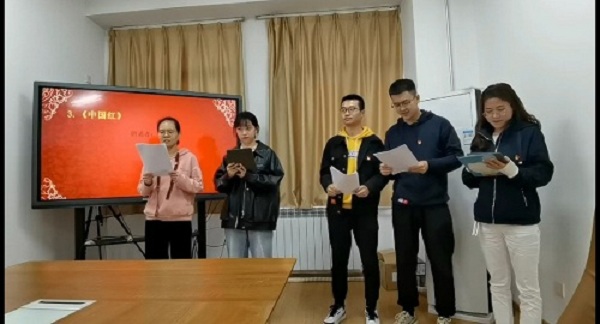 诗歌朗诵接近尾声,支部成员们被诗歌中红色激情时代的场景吸引,久久不能自拔。刘军弟老师总结时谈到:“回顾党的历史,我们党从小到大、由弱到强,在腥风血雨能够一次次绝境重生,在攻坚克难中能够不断从胜利走向胜利,根本原因就在于不管是处于顺境还是逆境,我们党始终坚持为中国人民谋幸福、为中华民族谋复兴的初心使命,义无反顾向着这个目标前进,从而赢得人民的衷心拥护和坚决支持。在我们党的领导下,党旗飘飘永远引领我们前进,每天早晨五星红旗能够高高升起,永远把我们的中国红撒向世界,描绘人类共同美好的未来!”