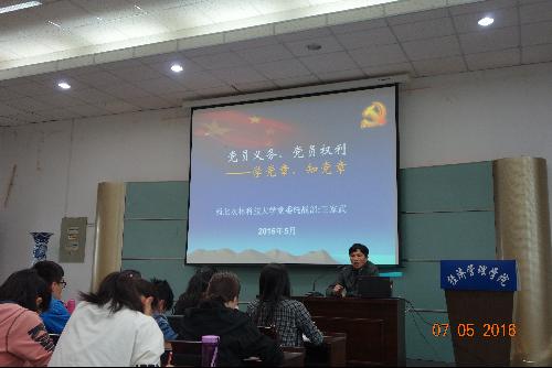 党委统战部王家武老师,分析了学习和践行党章的重大意义、作用及具体要求。深刻分析了党的性质、党的指导思想、党的宗旨和作风、党的纲领的内涵及有关要求,详细介绍了党员的权力与义务。并就目前在全体党员中开展的“两学一做”学习教育内容、意义向大家做了介绍,希望大家以“讲政治、有信念,讲规矩、有纪律,讲道德、有品行,讲奉献、有作为”为标准,认真履行党员义务,做一名合格党员。