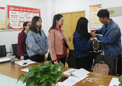 为了响应公司“亮身份、践承诺、树形象”主题实践活动安排,丁坤向支部成员介绍了“亮身份、践承诺、树形象”主题实践活动文件精神,并给支部党员和预备党员佩戴党徽,要求大家佩戴党徽,亮明身份,接受同学监督,积极发挥党员的先锋模范作用,切实做到热爱公益,乐于助人,积极组织并参加公益实践活动,践行党的宗旨。随后,丁坤带领支部全体成员面向党旗进行了庄严宣誓,重温入党誓词,明确责任担当,支部成员均签署了“亮身份、践承诺、树形象”主题实践活动承诺书,表达为人民服务的决心。