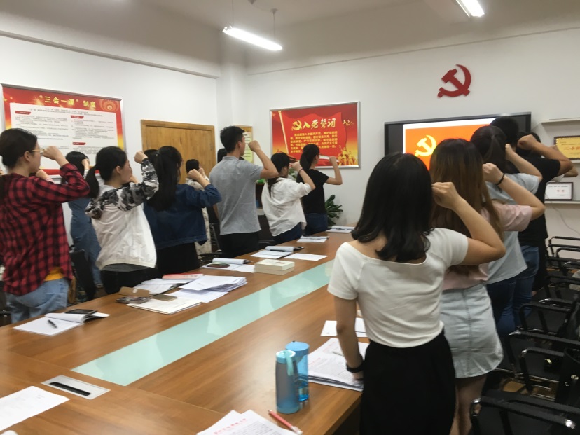 会议尾声,支部书记丁坤带领全体支部成员面向党旗宣誓,随后他对8名按期转正的同志表示衷心的祝贺并提出殷切希望,会议在轻松的氛围中圆满结束。