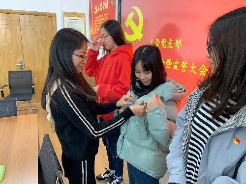 接着,陈文君同志带我们重温了入党誓词,在佩戴党徽仪式上,作为刚刚迈入党这一大家庭的年轻党员,朝气蓬勃的年轻人郑重的将中国共产党党徽置于胸前,并庄重地举起右拳宣读入党誓词,决定以实际行动为党增光,让身边的党员群众更真切的看到感受到党员的良好形象。