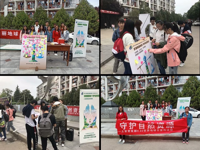 2019年4月22日是第50个“世界地球日”,为了加深同学们对“世界地球日”的理解和增强同学们节约资源、保护环境的意识,由土管党支部组织的“世界地球日”主题宣传活动在西农北校区西雕举办。此次活动的主题是“珍爱美丽地球,守护自然资源”。