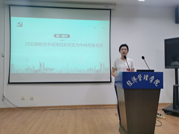 会议伊始,陆爽同志就本次大会纪律、参会情况及会议主要内容进行说明。池书瑶等四位同志依次就对党的认识、入党动机、本人履历、家庭和主要社会关系情况以及需向党组织说明的问题进行汇报;之后入党介绍人依次介绍了四位发展对象的有关情况,并对其能否入党表明意见;支部组织委员张思阳代表支委会报告了对池书瑶等四位同志的政治审查情况。接着,与会党员对发展对象能否入党进行充分讨论后进行了无记名投票,一致同意接收池书瑶等四位同志为中共预备党员,并由支部书记张昕婷为他们佩戴党徽。