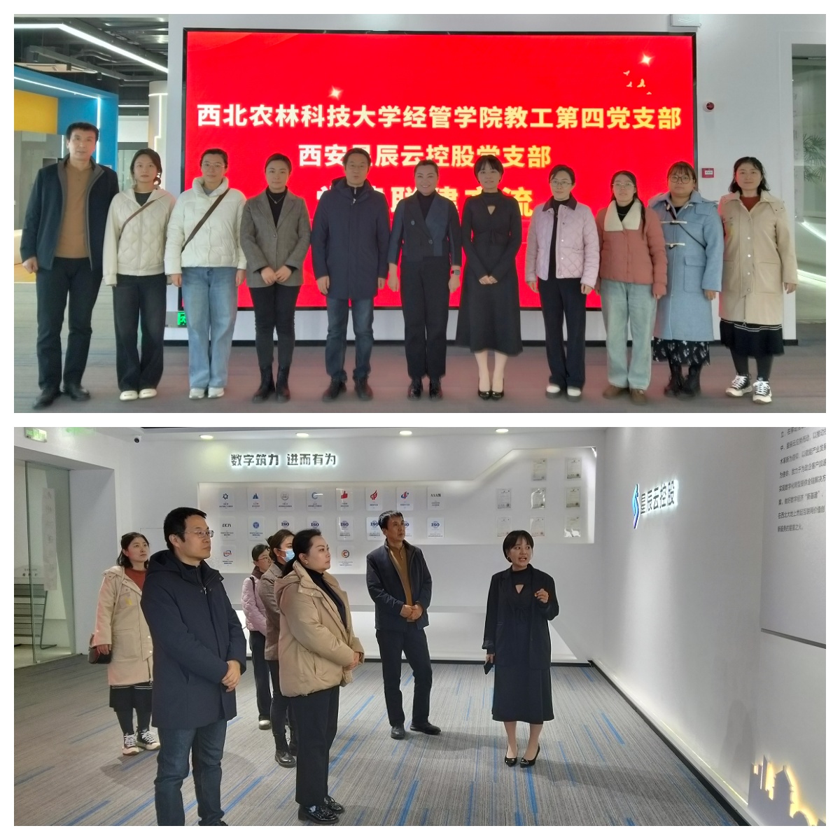 第二站,党员同志们来到员工企业西安星辰云控股集团,在集团董事长助理、党支部书记、MBA员工赵聪陪同讲解下,实地参观了企业数字化展厅,详细了解企业发展历程、核心业务与科技创新成果。座谈交流中,双方围绕非公党建、党员发展、企业文化建设、科技成果转化、创新及人才培养等进行了深入探讨,为进一步推进产学研融合、提升管理教辅服务水平提供了新思路。