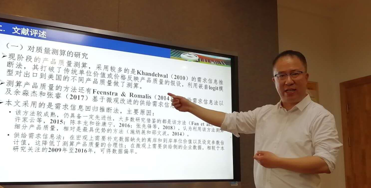 马述忠教授以自己学术生涯的成长为切入点,从论文的选题、理论模型的构建、实证数据的分析等诸多方面为师生带来了一场别开生面的学术报告。他首先对跨境电商对进口产品质量及其行业质量阶梯的影响进行了深入浅出的分析,其次,在构建一个两阶段信息博弈模型推理完全不同贸易渠道的企业基础上,分析了跨境电商降低交易成本和信息成本条件下的质量选择行为,并运用海关监管的数据进行了实证验证。该研究结果对我国实现高质量发展以及引领全球经济发展具有重要的时代意义,也为我国出台推动跨境电商进口发展的政策提供了新的经验证据。
